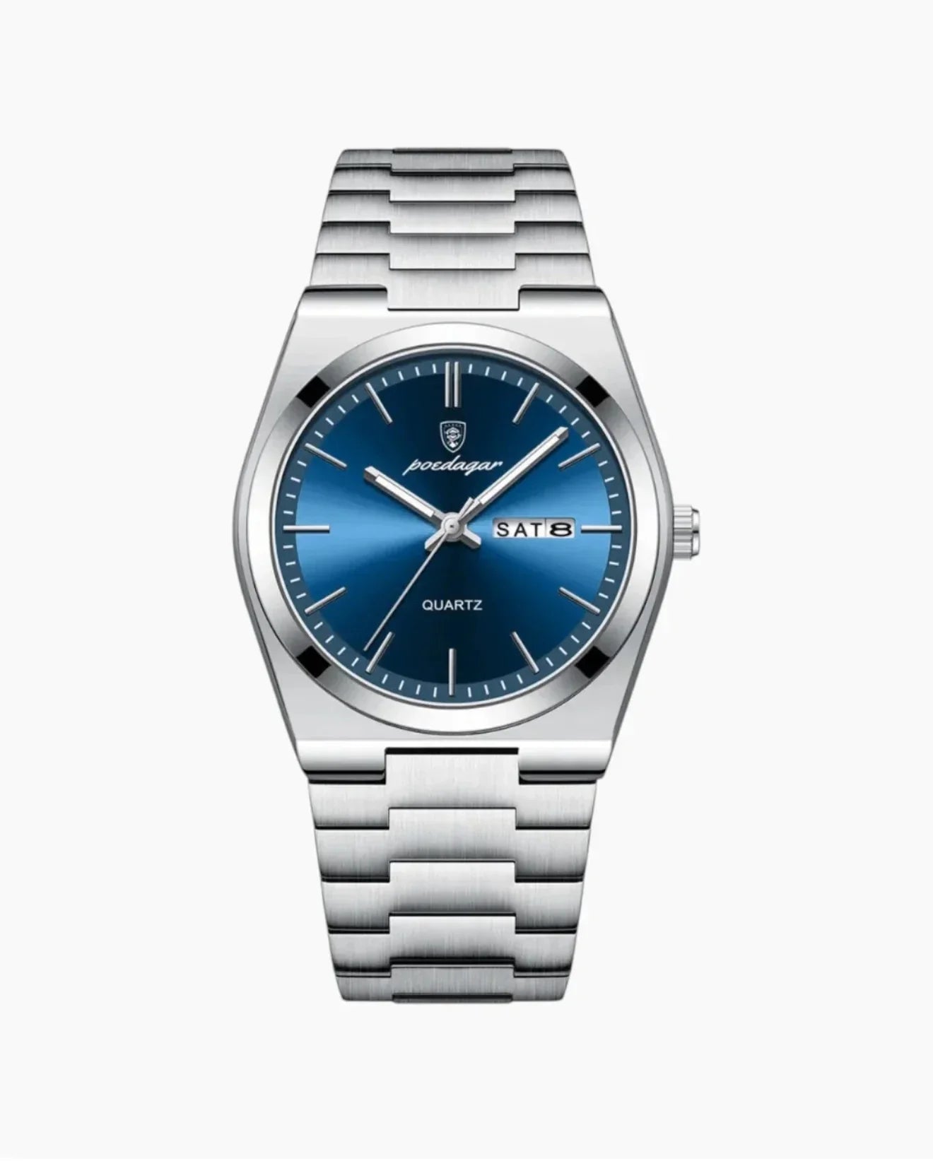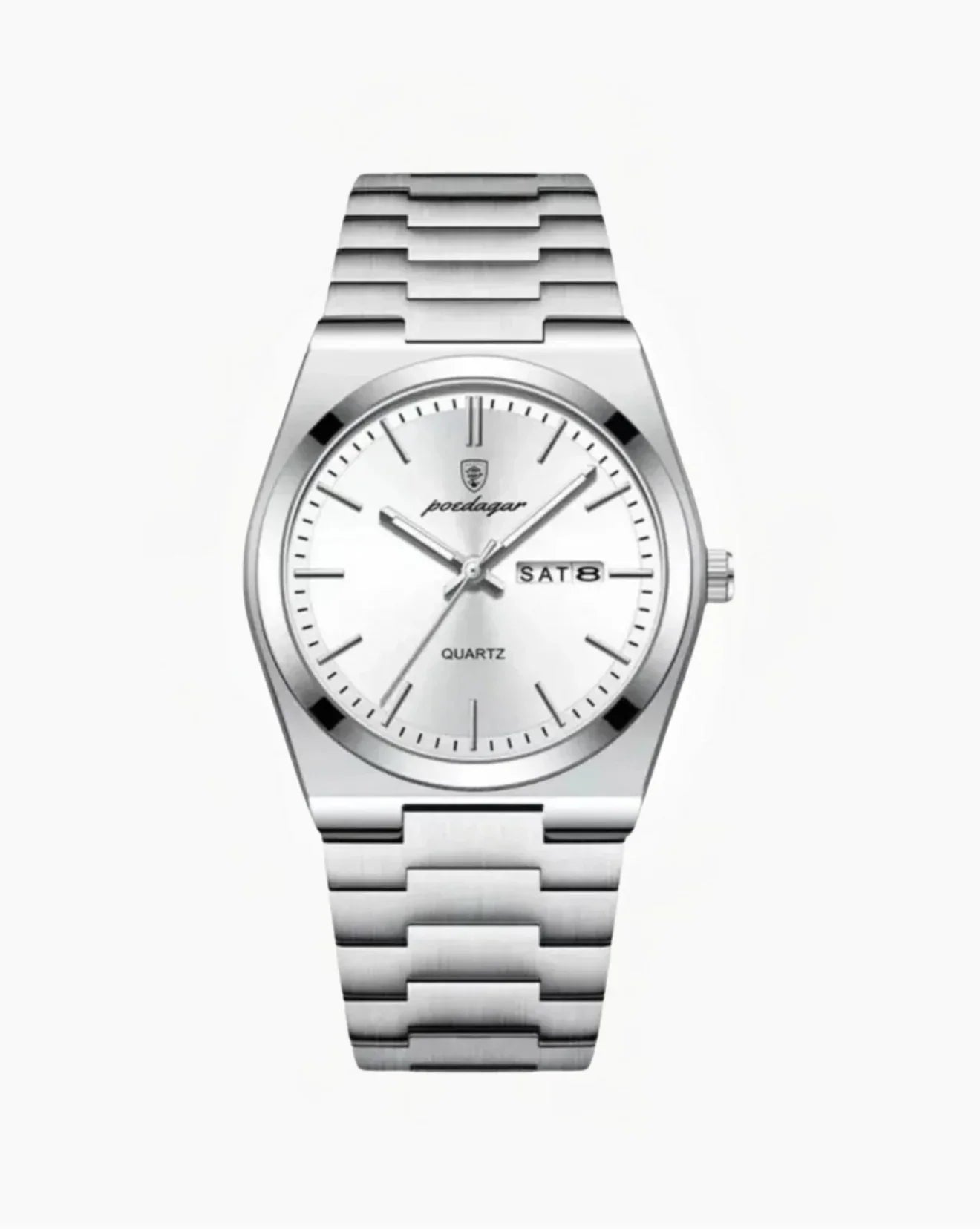 VALENCI embraces clean lines and a brushed stainless steel finish, offering a sleek balance of modern design and everyday durability. Its understated dial with day-date display delivers clarity and confidence at a glance.